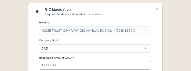 Newly created GICs now use value-based entry, making it easier to record the amount invested across Estate, Trust, and POA cases. Interest can be captured automatically during maturity or redemption, and accounting reports have been updated to group both past and new GIC types together.